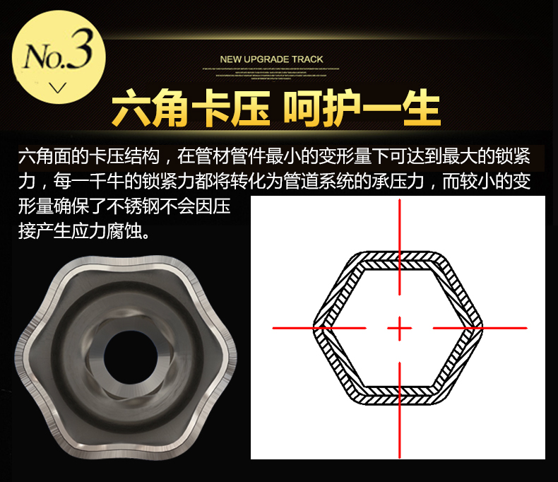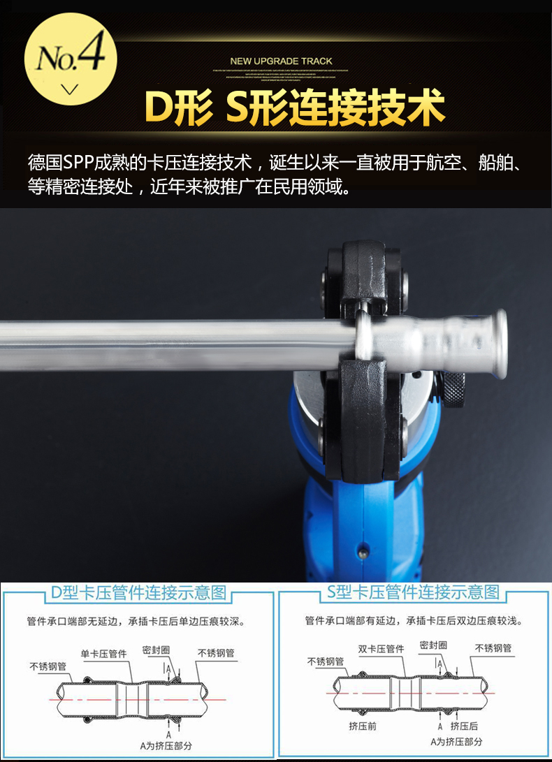 卡壓式連接~分單卡壓跟雙卡壓兩種,由德國率先垂範搭配使用的卡壓式好色先生TV网站,連接強度高,抗震動,滿足嵌入式安裝的要求,極大地減少了隱蔽環境中水管漏水的可能性,滿足了國家CECS153:2003標準,適合DN15-DN100口徑管道使用,避免明火焊接操作。