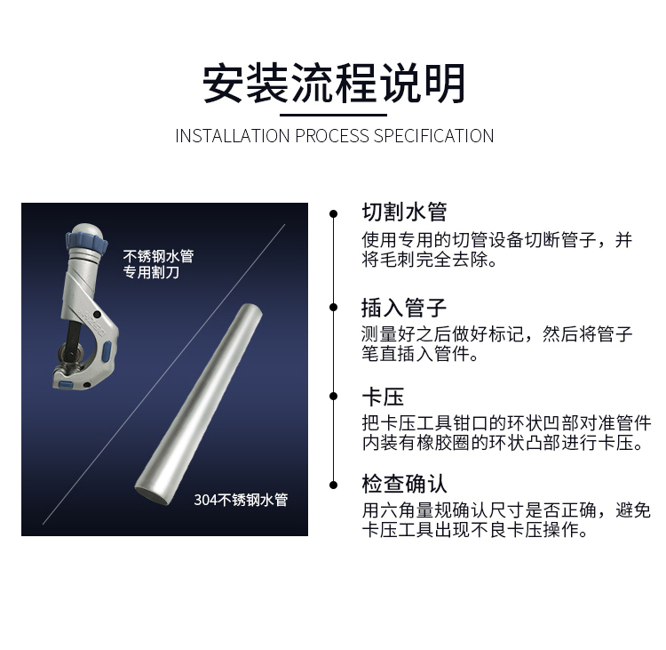 卡壓式連接~分單卡壓跟雙卡壓兩種,由德國率先垂範搭配使用的卡壓式好色先生TV网站,連接強度高,抗震動,滿足嵌入式安裝的要求,極大地減少了隱蔽環境中水管漏水的可能性,滿足了國家CECS153:2003標準,適合DN15-DN100口徑管道使用,避免明火焊接操作。
